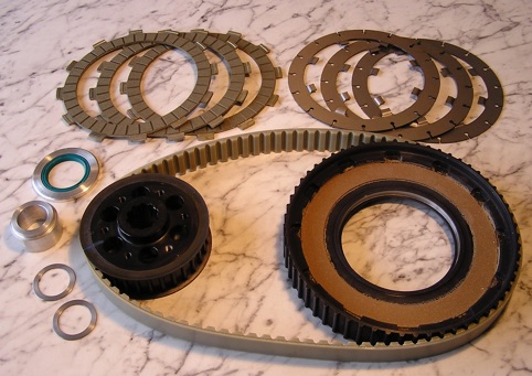 The belt is a 25mm wide polyurethane / steel AT10 Synchroflex belt with a large 10mm pitch. Yamaha R1 kevlar plates can be run wet in oil, or dry as required.