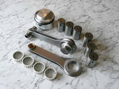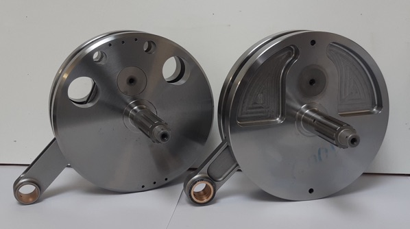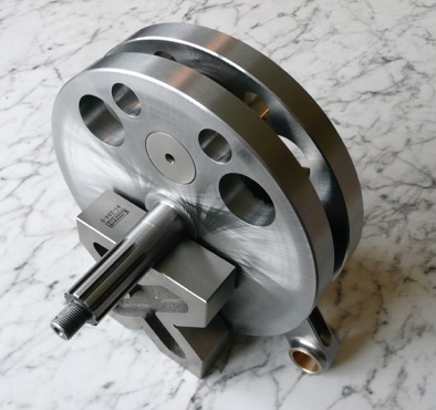 Below: on the left is KRT design flywheel and ‘H’ section conrod (178 gms little end) for fast road use and racing shown installed with parallel 35mm pin INA bearing. Price: £1,350.